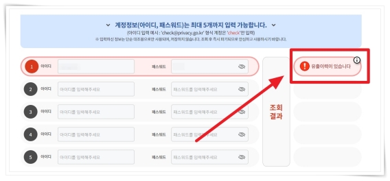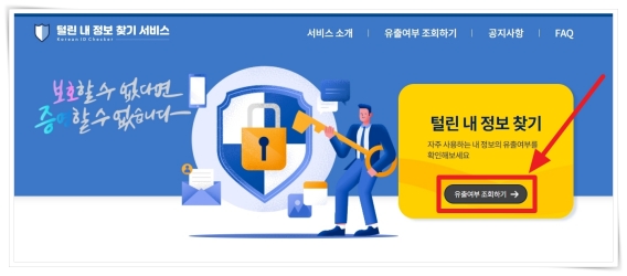 1. 홈페이지 중앙에 "유출여부 조회하기" 버튼을 클릭해 주세요.