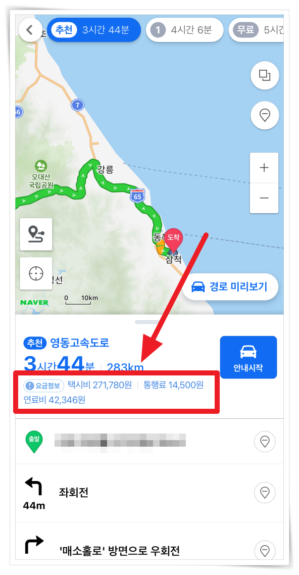 5. 좌측 하단 "상세경로"를 클릭하면 예상 요금정보를 볼 수 있습니다. 연료비, 통행료를 미리 확인하실 수 있어요.