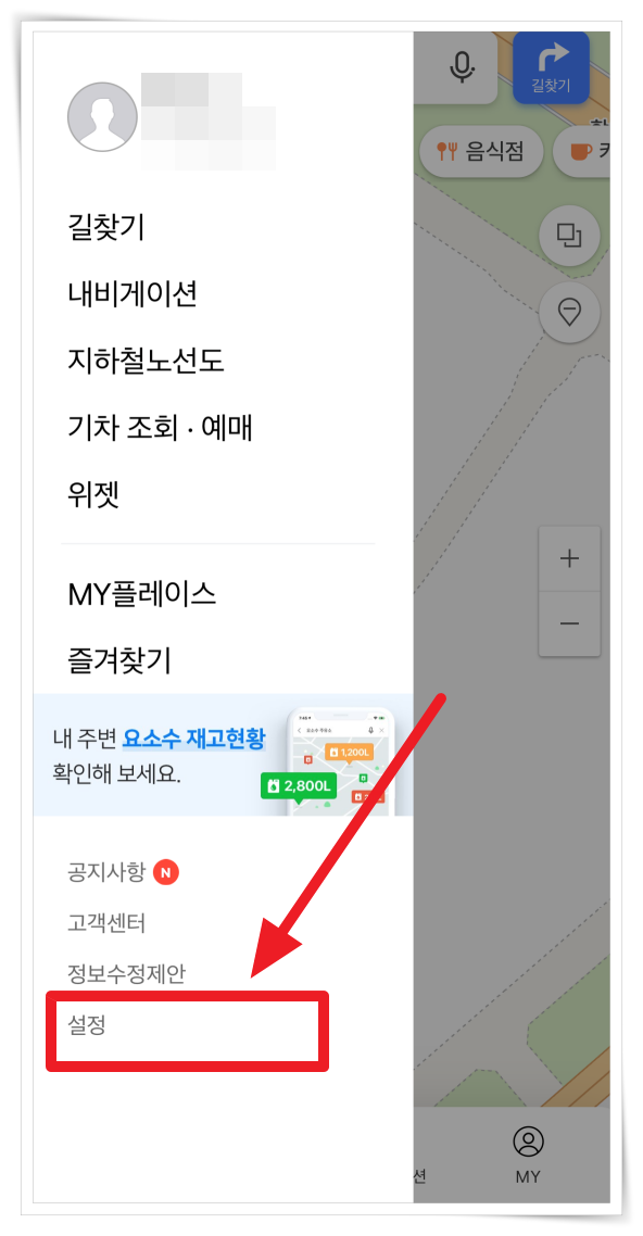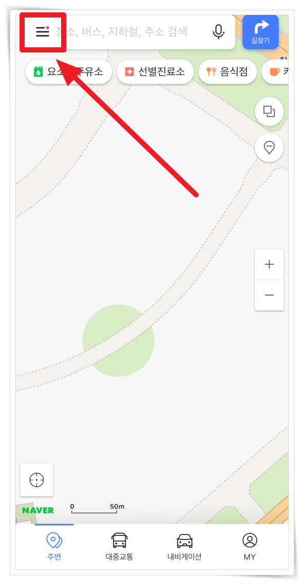 1. 네이버 지도 앱 설치 후 좌측 상단 메뉴에서 "설정"을 클릭해 주세요.