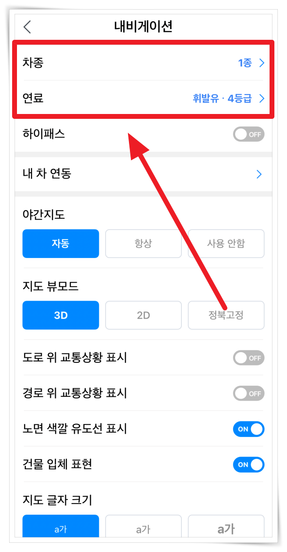 2. 설정에서 "내비게이션" > "차종과 연료"를 클릭해 주세요.