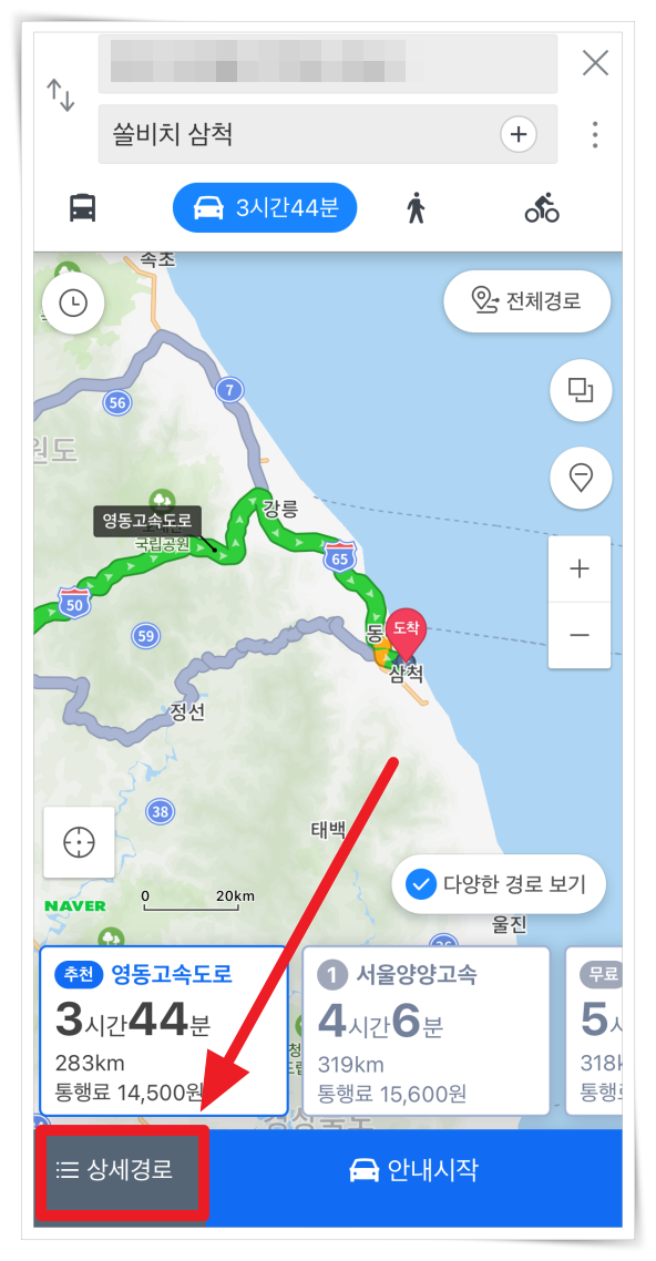 5. 좌측 하단 "상세경로"를 클릭하면 예상 요금정보를 볼 수 있습니다. 연료비, 통행료를 미리 확인하실 수 있어요.