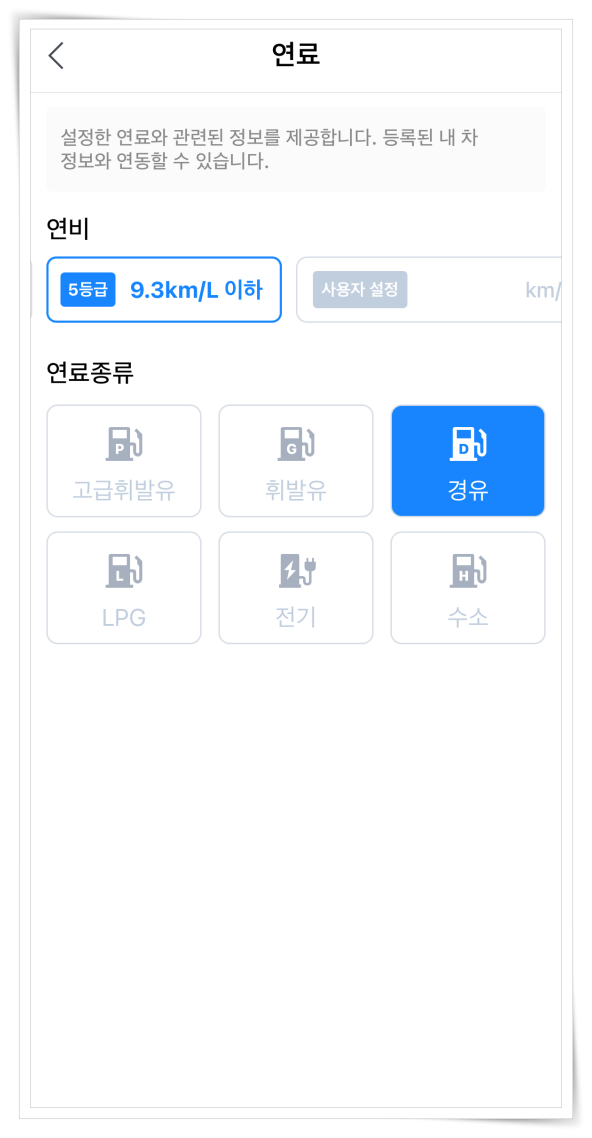 3. 연비, 연료종류, 차종을 자신의 차에 맞게 설정해 주세요.