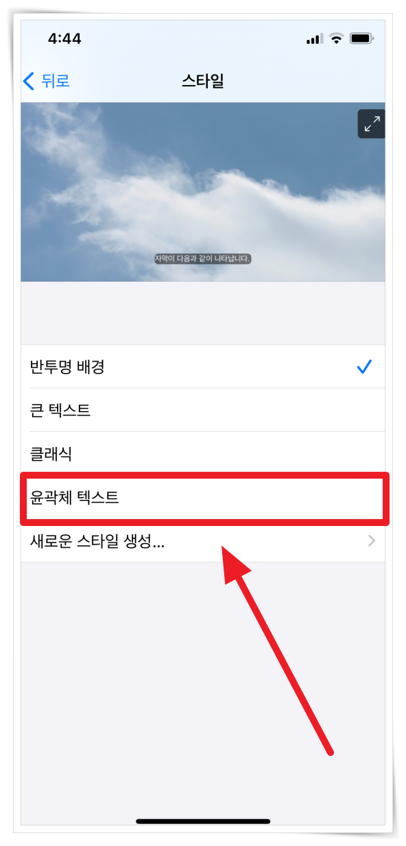 8. 반투명 배경에서 "윤곽체 텍스트"로 변경하면 일반적인 스타일로 설정하실 수 있어요.