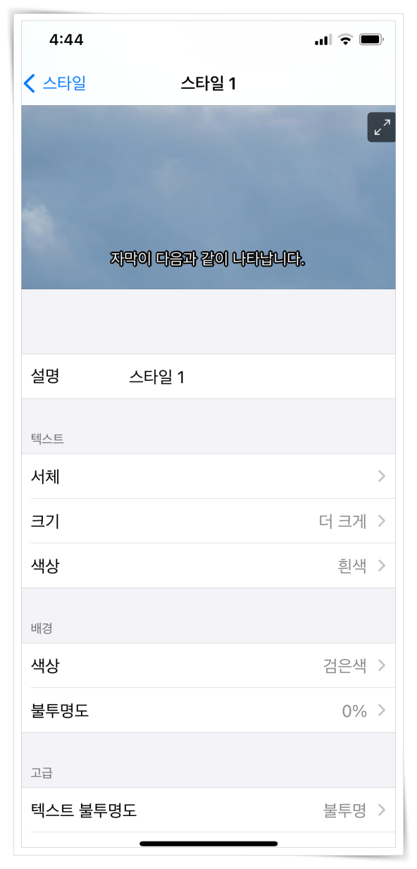 자막은 영상 우측 상단 설정을 통해 변경할 수 있는데요. 아이폰은 이러한 설정 인터페이스가 없더군요. 그래서 조금 다른 방법으로 수정해야 합니다.