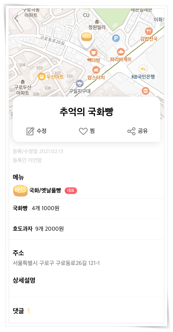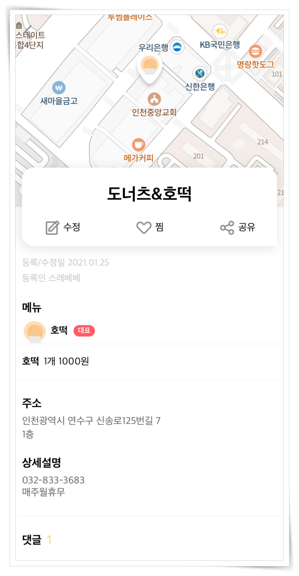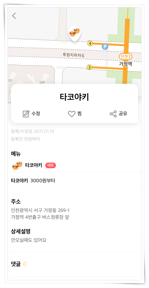 5. 지도에는 도너츠, 호떡, 타코야키, 국화빵 등 다양한 간식거리들이 표기됩니다. 유용하게 활용해 보세요.