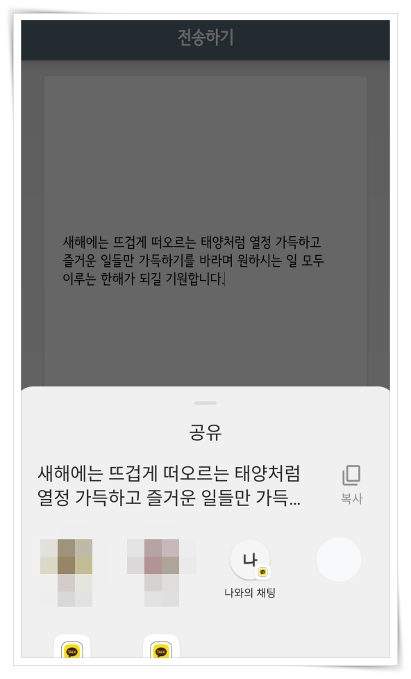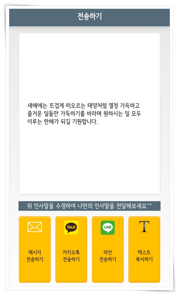 5. 완성된 문구는 메시지 전송, 카카오톡 전송, 라인 전송, 텍스트 복사 등으로 공유가 가능합니다.