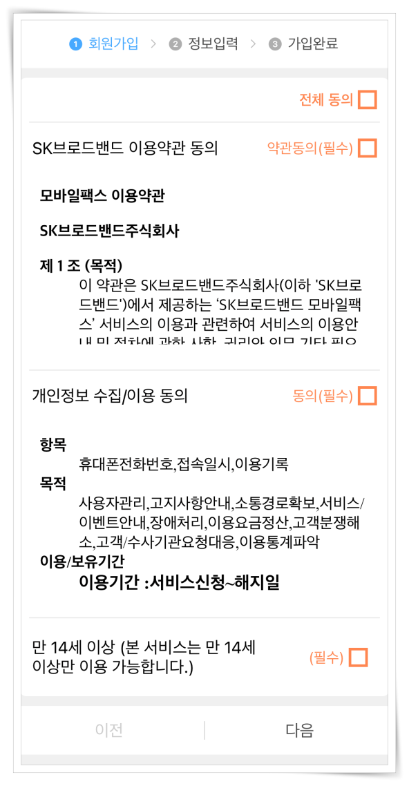 1. 와이파이 연결 해제로도 해결할 수 없다면 새로운 번호를 부여받아 사용하면 해결하실 수 있습니다. 기존 어플을 제거 후 다시 어플을 설치해 주세요. 그리고 SK브로드밴드 이용약관에 동의해 주세요.