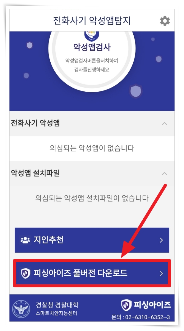 4. 검사 결과를 보면 앱과 설치 파일이 있는지 확인해 볼 수 있는데요. 더 정확한 검사를 원한다면 "피싱아이즈 풀버전"을 클릭해 주세요.