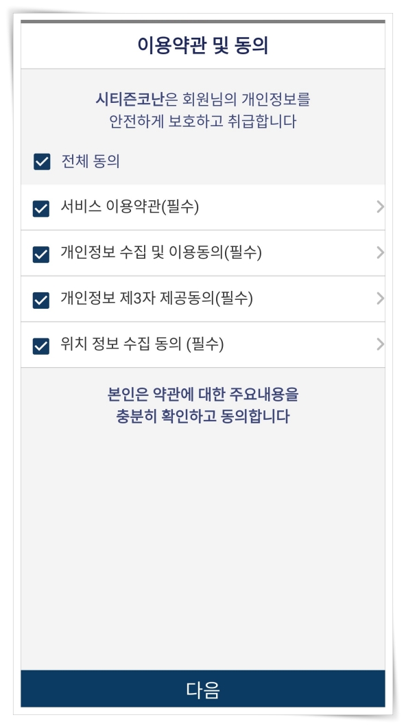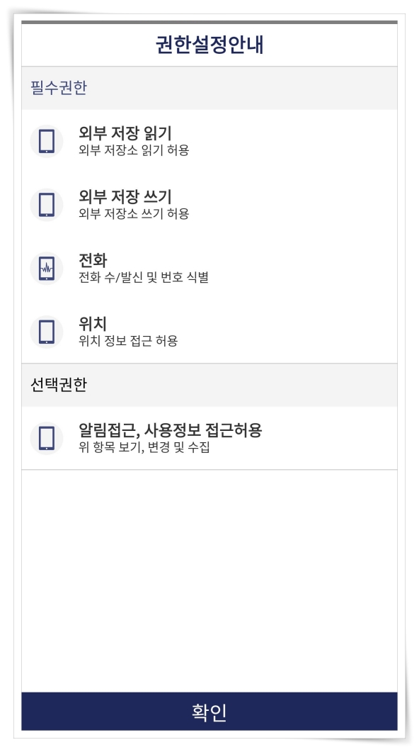 1. 앱 설치 후 권한설정 및 이용약관에 동의해 주세요.