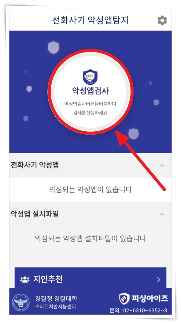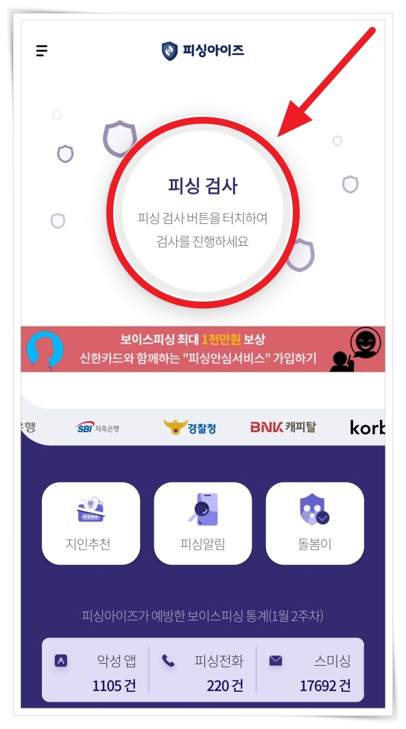 6. 앱 실행 후 "피싱 검사"를 클릭하여 검사를 진행해 주세요.
