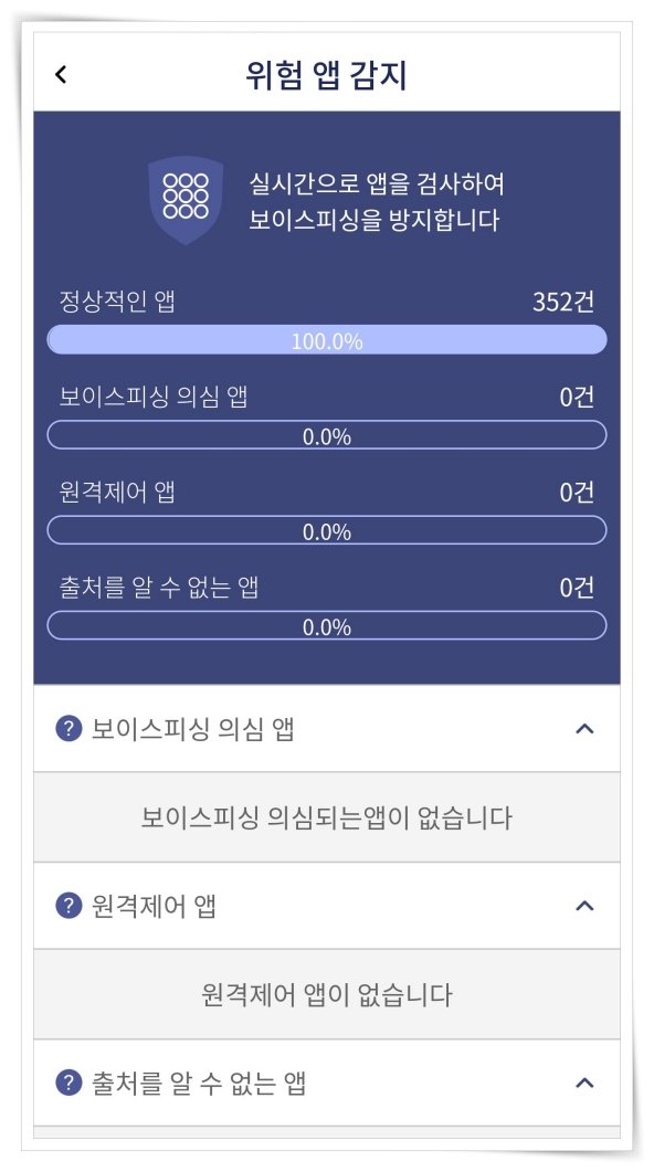 7. 그러면 정상적인 앱, 의심 앱, 원격제어 앱, 출처를 알 수 없는 앱을 확인해 볼 수 있습니다.