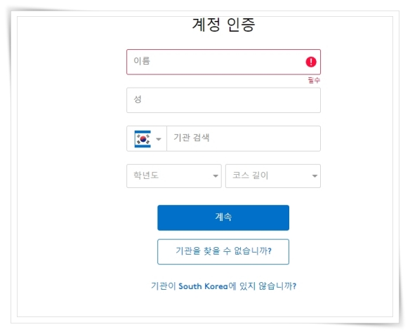 4. 이름, 기관, 학년도, 코스길이를 입력 후 "계속"을 클릭해 주세요.