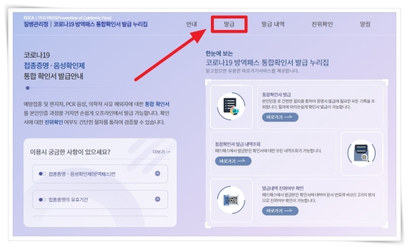1. 누리집 상단 메뉴에서 "발급"을 클릭해 주세요.