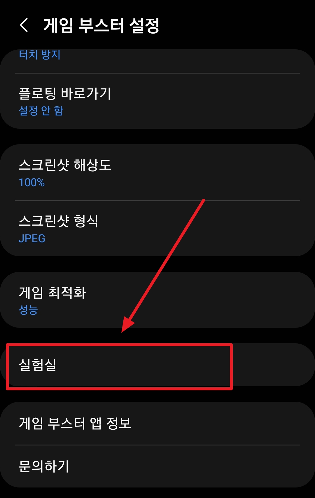 5. 게임 부스터 설정에서 "실험실"을 클릭해 주세요.