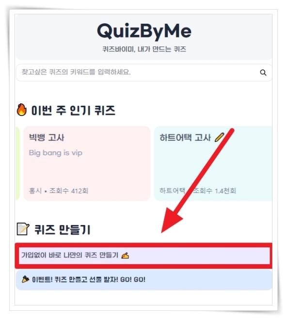 1. 홈페이지에서 "퀴즈 만들기"를 클릭해 주세요.