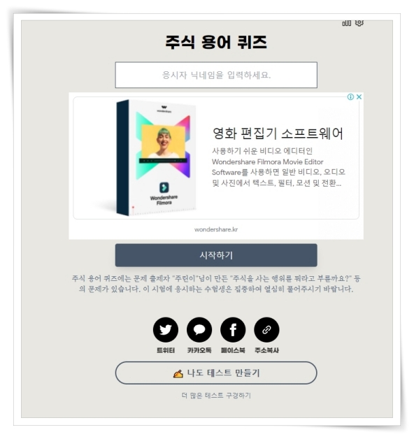 8. 테스트는 트위터, 카카오톡, 페이스북, 주소복사로 공유하실 수 있어요.