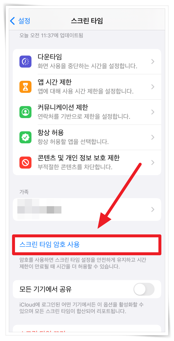 2. 메뉴에서 "스크린 타임 암호 사용"을 클릭 후 암호 4자리를 설정해 주세요.