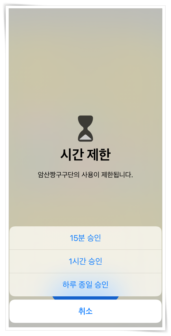 5. 설정된 시간이 지나면 제한창이 나오는데요. 하단 "시간 연장 요청하기"를 클릭하면 암호 입력 후 15분, 1시간, 하루종일 중 선택해서 연장이 가능합니다.