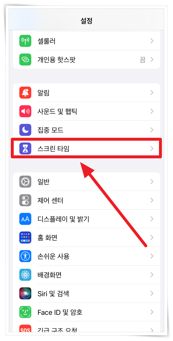 1. 아이폰 설정에서 "스크린 타임" 메뉴를 찾아 클릭해 주세요.