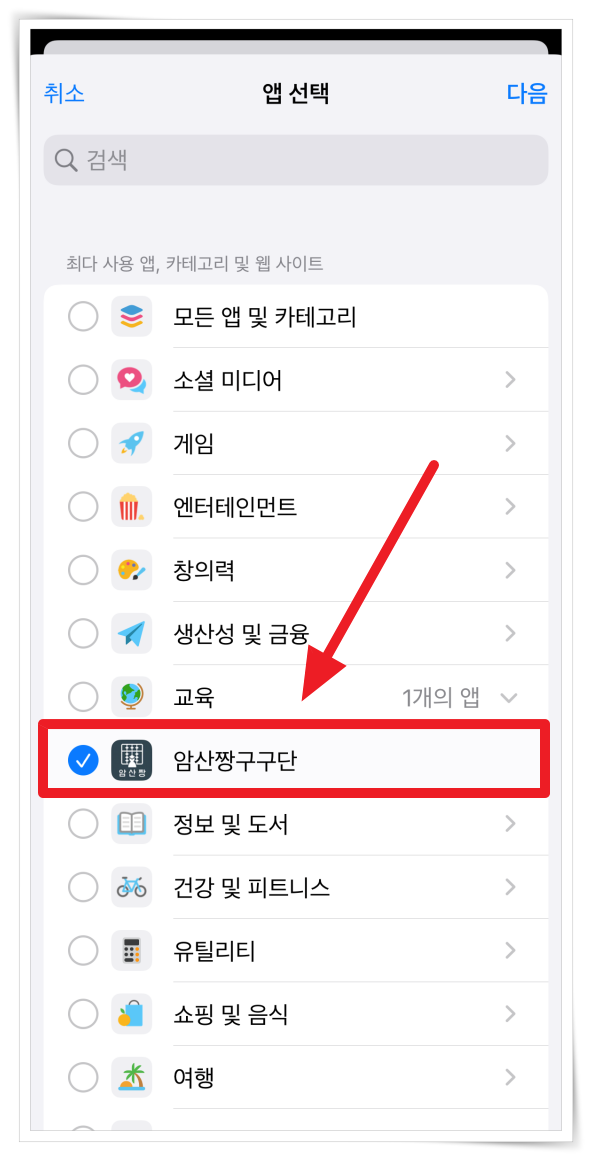 4. 설정하고 싶은 앱을 선택 후 시간을 선택해 주세요. 최소 1분까지 설정이 가능합니다.