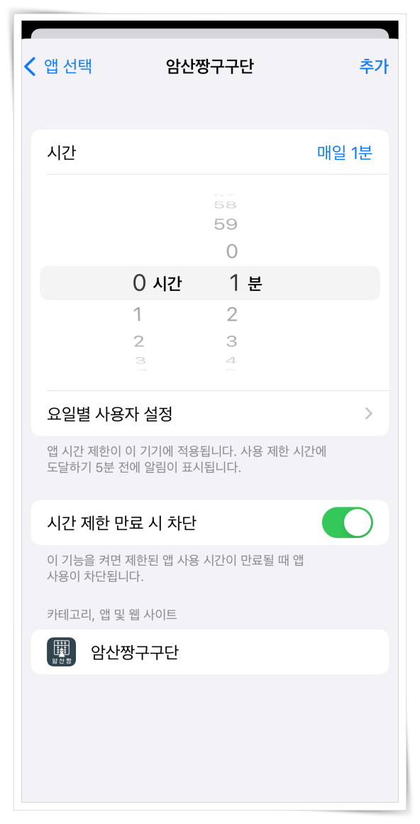 4. 설정하고 싶은 앱을 선택 후 시간을 선택해 주세요. 최소 1분까지 설정이 가능합니다.