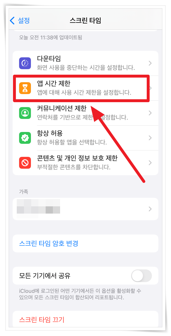 스크린 타임을 이용하면 본인뿐만 아니라 자녀의 앱에서 보내는 시간을 관리할 수 있고 실시간 분석 리포트도 볼 수 있어요. 그리고 이용 가능 시간을 1분으로 설정하면 다른 사람이 이용할 수 없는 잠금 기능으로도 활용할 수 있습니다.