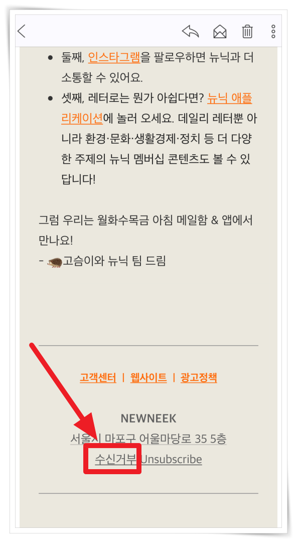 6. 이메일로 입력으로 구독하셨다면 받은 메일 맨 하단에 "수신거부"를 클릭해 주세요.