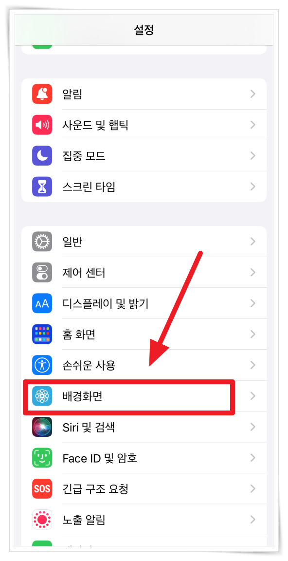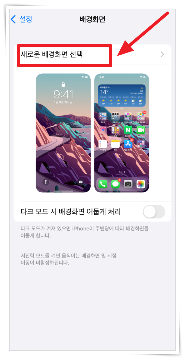 4. 아이폰 설정에서 "배경화면" > "새로운 배경화면 선택"을 클릭해 주세요.