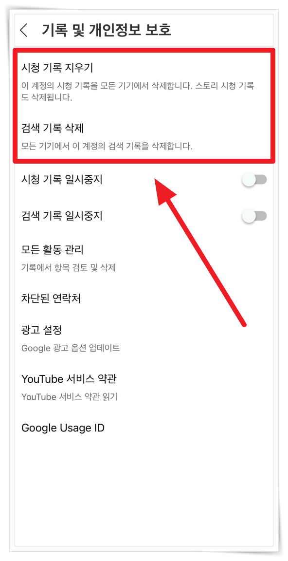 5. 시청 기록과 검색 일시 정지를 체크하면 시청한 동영상을 찾기 어려줘지고 추천 항목을 줄일 수 있다고 해요. 알고리즘 영향을 최대한 적게 받으려면 설정해 주세요.
