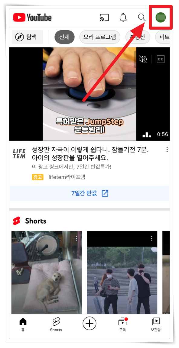 1. 유튜브 실행 후 우측 상단 "프로필" 이미지를 클릭해 주세요.