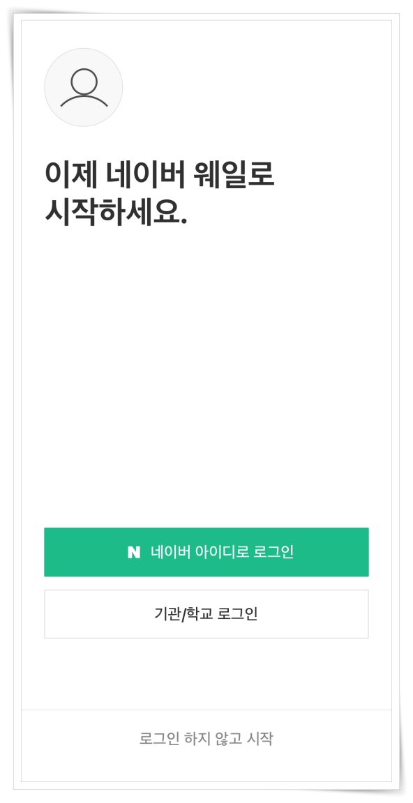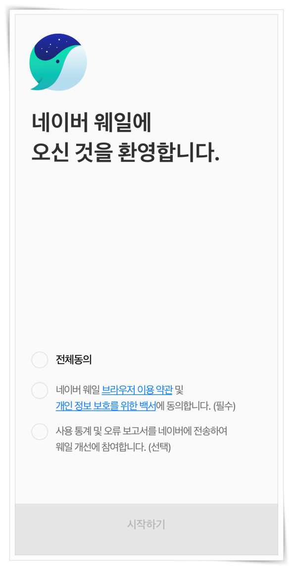 1. 먼저 웨일 모바일 앱 설치 후 이용약관 동의 및 네이버 아이디 로그인을 진행해 주세요.
