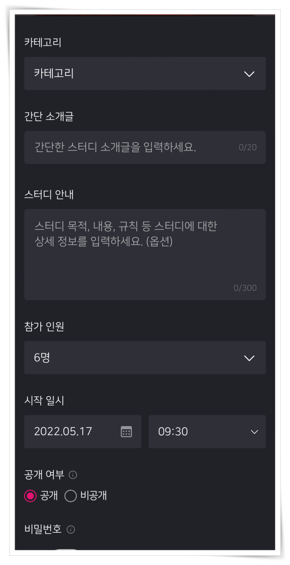 5. 카테고리, 간단 소개글, 스터디 안내, 참가인원, 시작일시 등 정보를 입력 후 "만들기"를 클릭해 주세요.