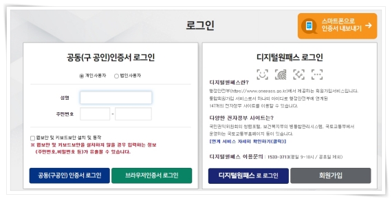 2. 공동인증서 또는 디지털원패스로 로그인해 주세요.