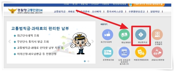 1. 홈페이지 중단 바로가기에서 "미납범칙금"을 클릭해 주세요.