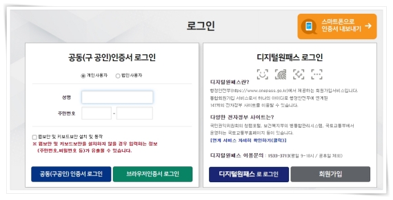 2. 공동인증서 또는 디지털원패스로 로그인해 주세요.