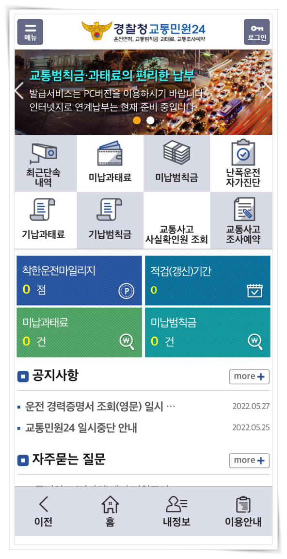 교통 법규를 잘 지켜서 과태료나 범칙금을 납부해야 되는 상황은 피해야겠지만 사람 일이라는 게 실수할 때도 있고 노란불처럼 애매한 상황인 경우도 생길 수 있습니다. 이럴 때는 위반 사실을 실시간으로 조회하는 방법이 있습니다. 경찰청 교통민원24 홈페이지 또는 앱에서 본인 인증 후 최근 단속내역을 확인하실 수 있습니다.