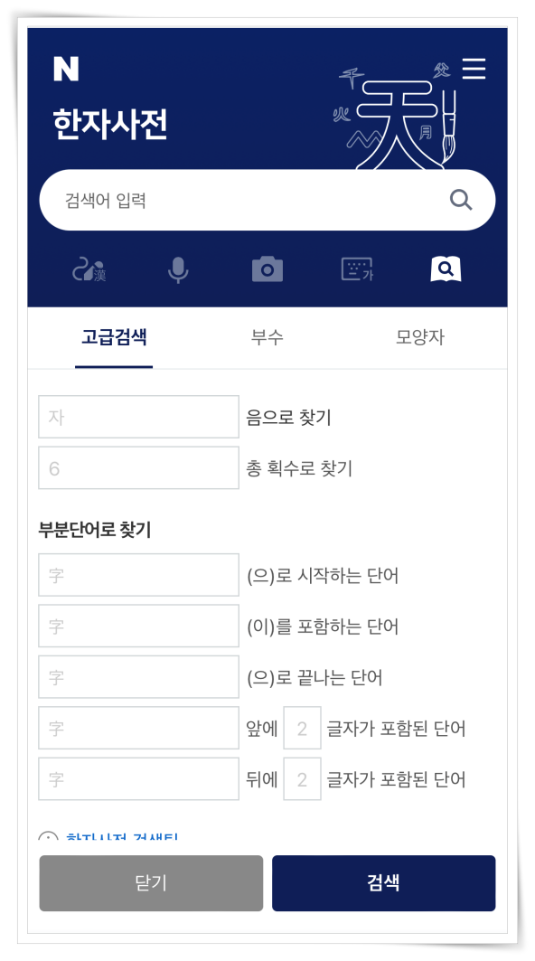 4. 옥편 처럼 사용하려면 상단 메뉴 맨 우측에 있는 "검색" 아이콘을 클릭해 주세요. 그러면 부수, 모양자, 고급검색을 이용하실 수 있습니다.