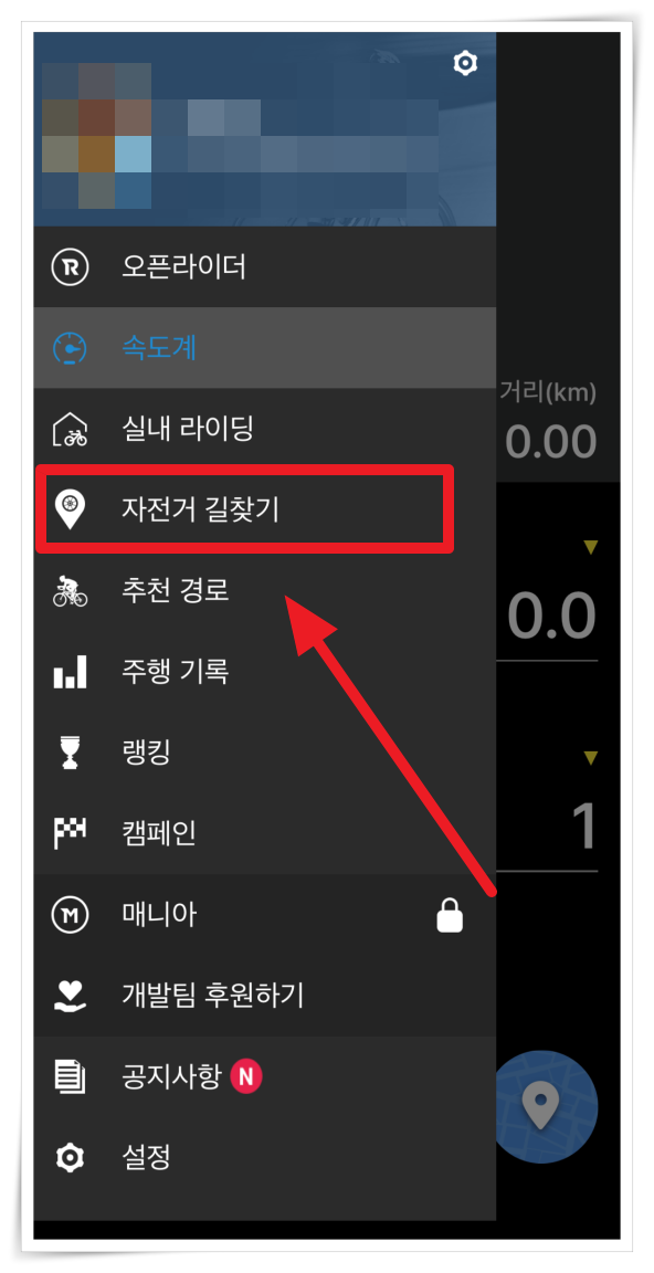 3. 메뉴에서 "자전거 길찾기"를 클릭해 주세요.