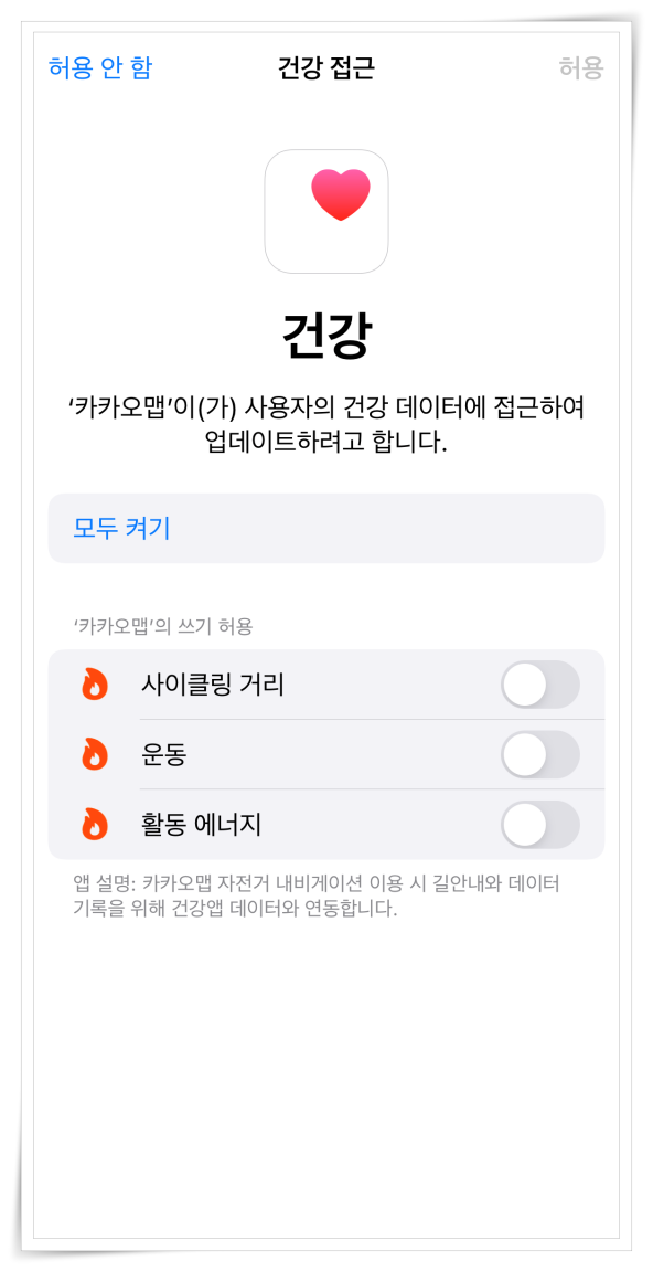 3. 사이클링 거리, 운동, 활성에너지 등 건강 데이터를 이용하려면 "허용"을 체크해 주세요.