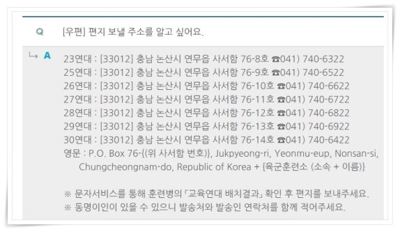 4. 훈련병에게 택배를 보내려면 아래 이미지에서 연대 주소를 찾아 "0연대 0중대 0소대 000번 훈련병 000"로 보내면 됩니다. 다만 사서함 주소라 우체국택배만 훈련소에 전달됩니다.