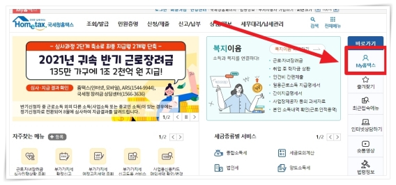 1. 홈텍스 홈페이지우측 바로가기 메뉴에서 "My홈텍스"를 클릭해 주세요.