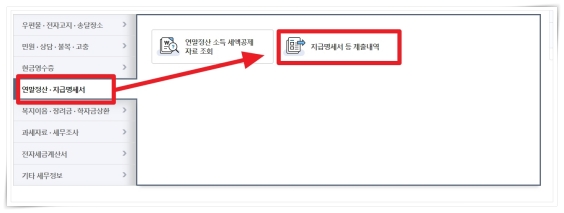 4. 좌측 메뉴에서 "연말정산, 지급명세서"을 선택 후 "지급명세서 등 제출내역"을 클릭해 주세요.