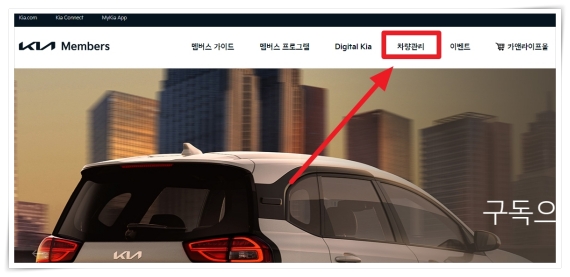 1. 공식 홈페이지 상단 메뉴에서 "차량관리"를 클릭해 주세요.