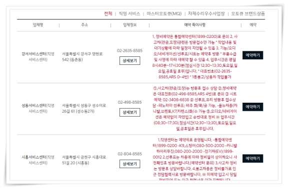 직영점을 찾는 방법은 공식사이트에서 AUTO Q 검색을 통해 확인해볼 수 있습니다. 지역/키워드/조건 중 한 가지 검색 조건을 선택하여 검색하면 검색 결과에서 온라인 정비 예약까지 가능합니다.