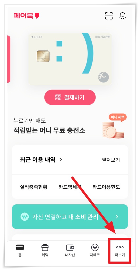 1. 먼저 페이북 앱 실행 후 우측 하단 "더보기"를 클릭해 주세요.