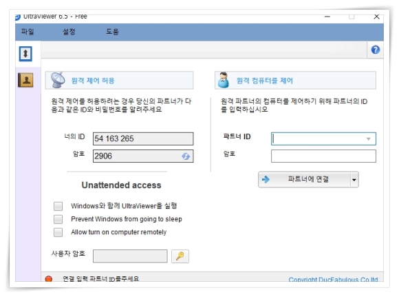 3. 프로그램이 실행되면 다른 컴퓨터의 ID와 암호를 입력하면 연결하실 수 있습니다. 암호는 수시로 변경하실 수 있습니다.