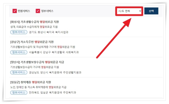 3. 상단 지역 검색에서 시/도를 선택해 주세요.
