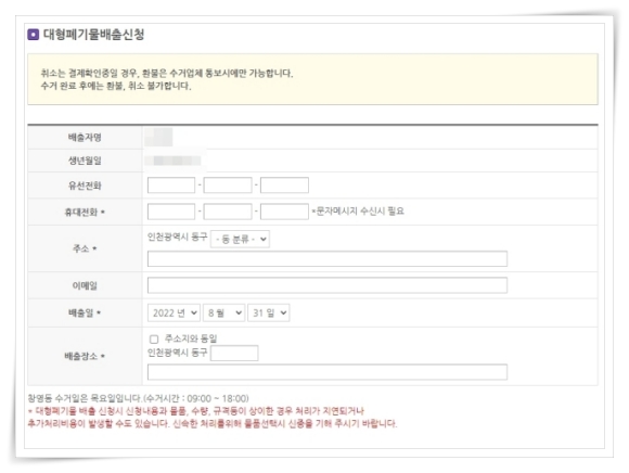 4. 배출 신청자의 개인 정보와 배출일, 배출장소를 입력해 주세요.