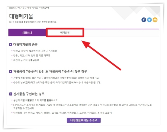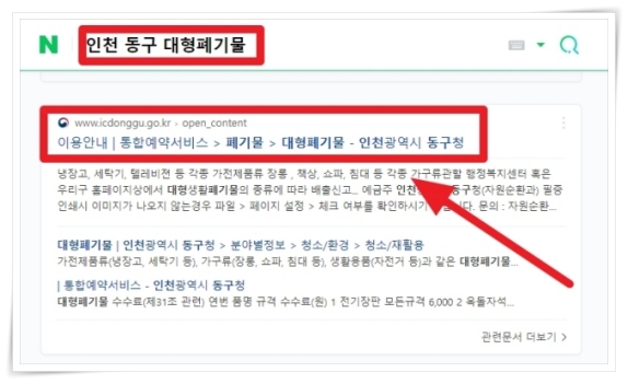 1. 네이버 검색창에 지역 뒤에 "대형폐기물"을 붙여서 검색하면 대부분 통합예약 서비스 홈페이지를 쉽게 찾으실 수 있습니다.