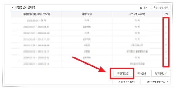 6. 가입내역에서 특정사업장을 선택 후 "프린터 발급"을 클릭해 주세요.
